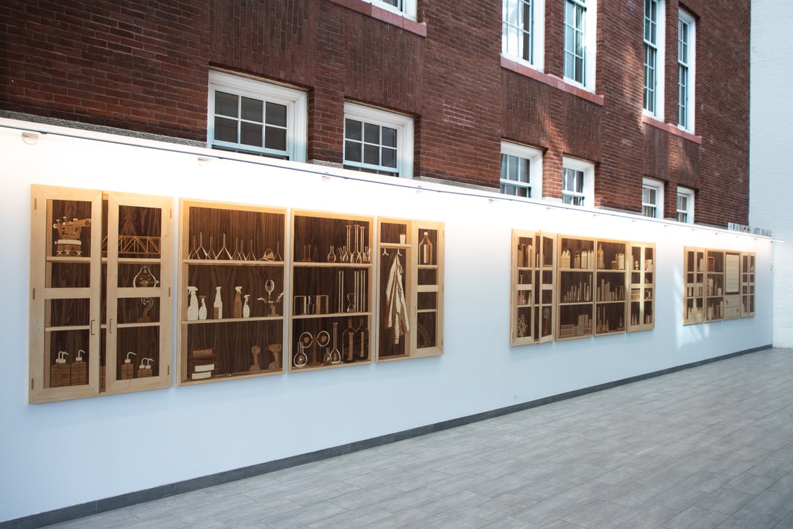 We are so delighted to present Xylotheque’s Nocturne by Kate Conlon and Boyang Hou, the newest addition to our public art program and the latest iteration of the Henricks Art Wall, a rotating exhibition space in the atrium of the Tsungming Tu Complex (TTC), featuring newly commissioned artworks by artists affiliated with Tufts-SMFA, and generously supported by Joan M. Henricks, J69, and Alan S. Henricks. Conlon and Hou, both faculty at SMFA at Tufts and collaborators under the moniker Limited Time Engagement (LTE) used laser-cut wood inlay to depict modern-day cabinets of curiosities with laboratory imagery from the TTC. These panels create a portrait of the TTC’s spaces for learning and research through a merger of ancient and contemporary techniques, harkening to a time when the arts and sciences were a single, shared discipline of human achievement. The installation’s title, Xylotheque’s Nocturne, alludes to historical collections of book-shaped wood specimens housed in fashionable cabinets, known in their time as xylotheques—while also referencing the TTC’s focus on research and the artwork’s own materiality. |